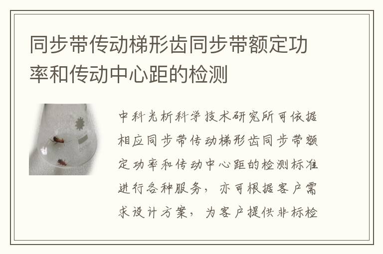 關(guān)鍵詞:同步帶傳動(dòng)梯形齒同步帶額定功率和傳動(dòng)中心距的項(xiàng)目報(bào)價(jià),同步帶傳動(dòng)梯形齒同步帶額定功率和傳動(dòng)中心距的測(cè)試周期,同步帶傳動(dòng)梯形齒同步帶額定功率和傳動(dòng)中心距的測(cè)試方法