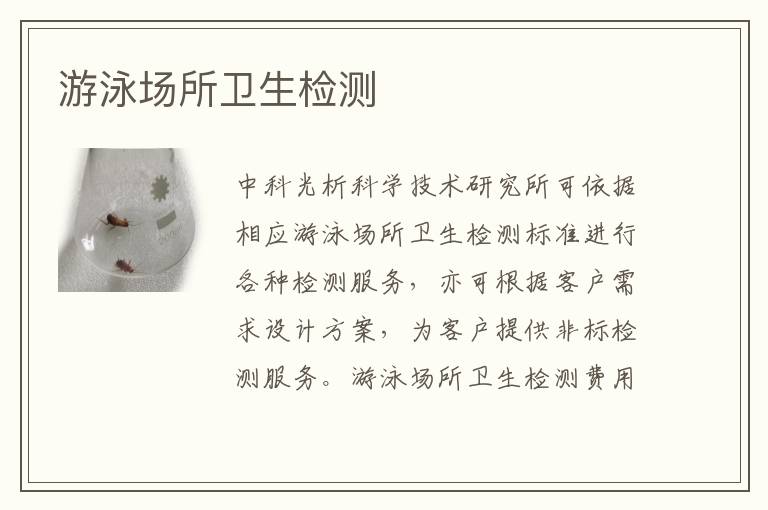 關(guān)鍵詞:游泳場所衛(wèi)生測試儀器,游泳場所衛(wèi)生測試周期,游泳場所衛(wèi)生測試方法