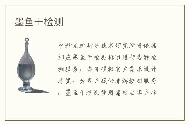 中科光析科學技術中析研究所可依據(jù)相應墨魚干檢測標準進行各種檢測服務,亦可根據(jù)客戶需求設計方案,為客戶提供非標檢測服務。墨魚干檢測費用需結合客戶檢測需求以及實驗復雜程度進行報價。一般7-15個工作日可出具檢測報告。 ```html墨魚干檢測是一種針對墨魚干等干制海產品的質量與安全性分析方法,旨在確保產品符合食品衛(wèi)生標準以及相關法律法規(guī)。通過科學檢測手段,可以全面評估墨魚干的營養(yǎng)成分、質量指標、重金屬及農藥殘留等,其目的是從食品安全和消費者健康的角度出發(fā),對墨魚干的質量進行嚴格把控。