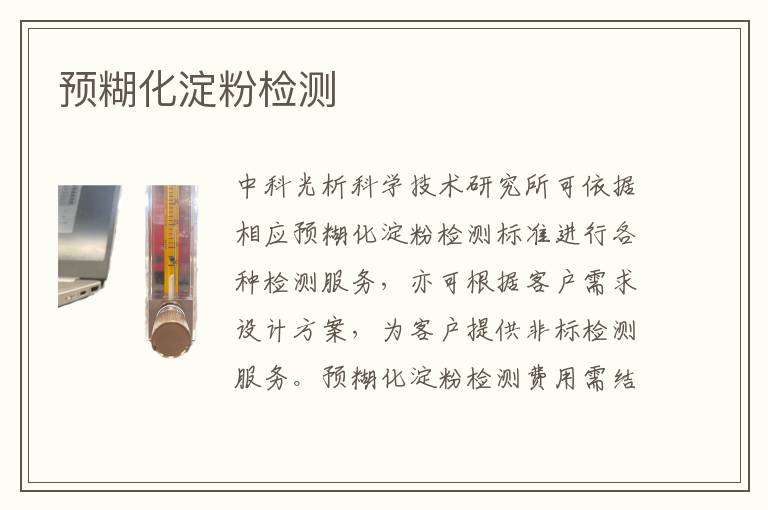 中科光析科學(xué)技術(shù)中析研究所可依據(jù)相應(yīng)預(yù)糊化淀粉檢測標(biāo)準(zhǔn)進(jìn)行各種檢測服務(wù),亦可根據(jù)客戶需求設(shè)計(jì)方案,為客戶提供非標(biāo)檢測服務(wù)。預(yù)糊化淀粉檢測費(fèi)用需結(jié)合客戶檢測需求以及實(shí)驗(yàn)復(fù)雜程度進(jìn)行報(bào)價。一般7-15個工作日可出具檢測報(bào)告。 ```html預(yù)糊化淀粉是一種經(jīng)過特殊處理使其在冷水中快速溶解的淀粉產(chǎn)品,廣泛應(yīng)用于食品、醫(yī)藥、建筑等多個行業(yè)。檢測預(yù)糊化淀粉的質(zhì)量和性能對抑制劣質(zhì)產(chǎn)品流入市場及確保產(chǎn)品安全具有重要意義。該檢測評估淀粉糊化后粘度、穩(wěn)定性等多個指標(biāo),以確定產(chǎn)品的適用性和優(yōu)劣。
