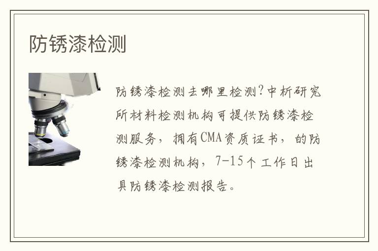 防銹漆檢測(cè)去哪里檢測(cè)?中析研究所材料檢測(cè)機(jī)構(gòu)可提供防銹漆檢測(cè)服務(wù),CMA資質(zhì)認(rèn)證機(jī)構(gòu),高新技術(shù)企業(yè),正規(guī)的第三方檢測(cè)機(jī)構(gòu),7-15個(gè)工作日出具防銹漆檢測(cè)報(bào)告,檢測(cè)周期短、檢測(cè)費(fèi)用低、檢測(cè)結(jié)果科學(xué)準(zhǔn)確!