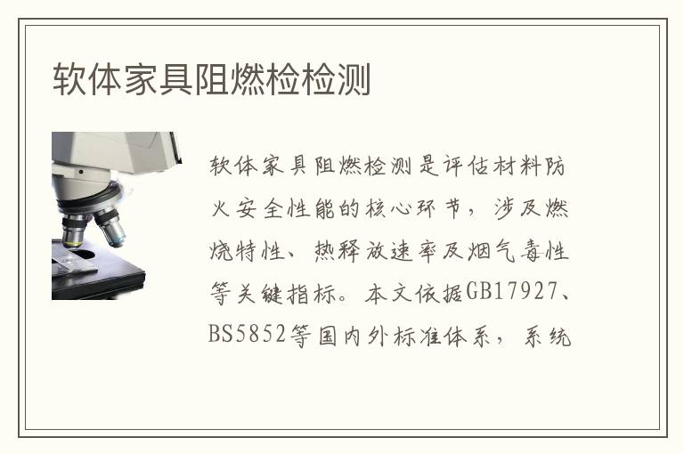 關(guān)鍵詞:軟體家具阻燃檢項(xiàng)目報(bào)價(jià),軟體家具阻燃檢測(cè)試標(biāo)準(zhǔn),軟體家具阻燃檢測(cè)試范圍