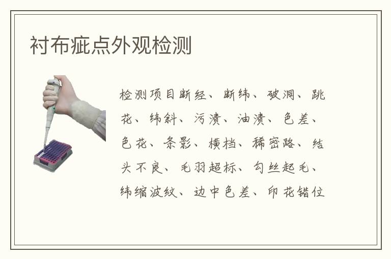 1.目測法:在標(biāo)準(zhǔn)光源箱D65照明條件下進(jìn)行表面觀察,依據(jù)GB/T17760分級評定表面疵點2.放大鏡法:使用10倍手持放大鏡識別微細(xì)纖維斷裂或0.1mm級針孔缺陷3.拉伸測試:通過電子織物強(qiáng)力機(jī)按GB/T3923.1測定接縫滑移量4.密度分析:采用織物密度鏡按GB/T4668測量10cm內(nèi)經(jīng)緯紗線根數(shù)5.色差評定:使用分光測色儀按ISO105-J03測定ΔE值6.尺寸穩(wěn)定性:依據(jù)AATCC135進(jìn)行5次洗滌后測量縮水率7.起毛起球測試:按GB/T4802.1在圓軌跡法起球儀完成5000次摩擦循環(huán)8.透光檢測:采用背光觀察臺識別厚度不均或隱形疵點9.熱熔膠剝離強(qiáng)度:使用萬能材料試驗機(jī)按FZ/T01085測試10.纖維成分分析:通過顯微鏡觀察結(jié)合燃燒法鑒別混紡比例