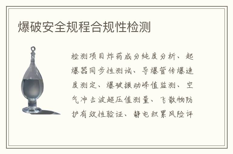 關(guān)鍵詞:爆破安全規(guī)程合規(guī)性項(xiàng)目報(bào)價(jià),爆破安全規(guī)程合規(guī)性測(cè)試機(jī)構(gòu),爆破安全規(guī)程合規(guī)性測(cè)試周期