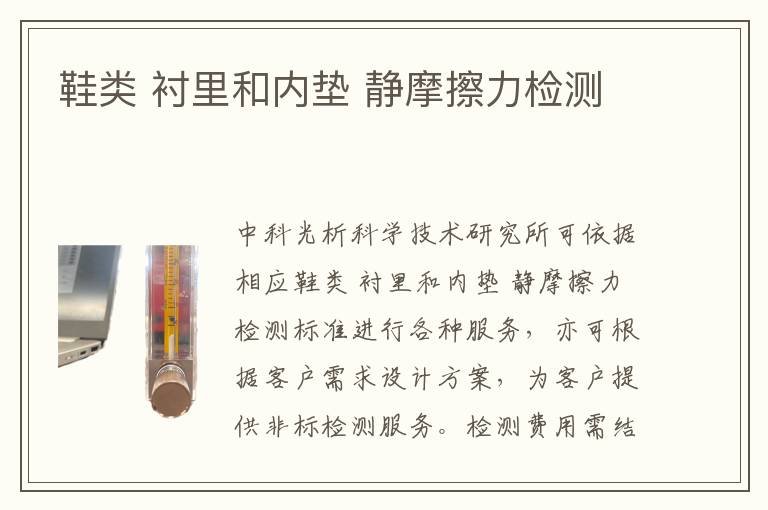 關鍵詞:鞋類襯里和內(nèi)墊靜摩擦力測試機構,鞋類襯里和內(nèi)墊靜摩擦力測試標準,鞋類襯里和內(nèi)墊靜摩擦力測試案例
