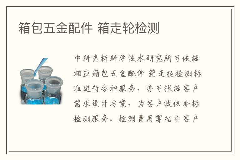 關(guān)鍵詞:箱包五金配件箱走輪測(cè)試周期,箱包五金配件箱走輪測(cè)試標(biāo)準(zhǔn),箱包五金配件箱走輪測(cè)試案例