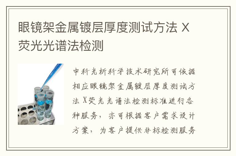 關(guān)鍵詞:眼鏡架金屬鍍層厚度測(cè)試方法X熒光光譜法測(cè)試方法,眼鏡架金屬鍍層厚度測(cè)試方法X熒光光譜法項(xiàng)目報(bào)價(jià),眼鏡架金屬鍍層厚度測(cè)試方法X熒光光譜法測(cè)試標(biāo)準(zhǔn)