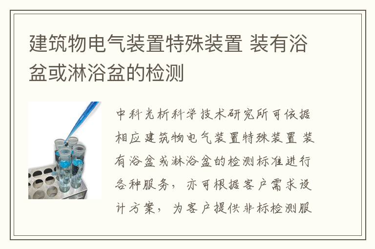 關(guān)鍵詞:建筑物電氣裝置特殊裝置裝有浴盆或淋浴盆的測(cè)試范圍,建筑物電氣裝置特殊裝置裝有浴盆或淋浴盆的項(xiàng)目報(bào)價(jià),建筑物電氣裝置特殊裝置裝有浴盆或淋浴盆的測(cè)試周期