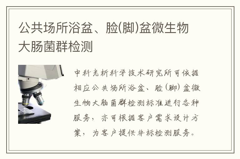 關(guān)鍵詞:公共場所浴盆、臉(腳)盆微生物大腸菌群測試案例,公共場所浴盆、臉(腳)盆微生物大腸菌群測試標(biāo)準(zhǔn),公共場所浴盆、臉(腳)盆微生物大腸菌群測試方法